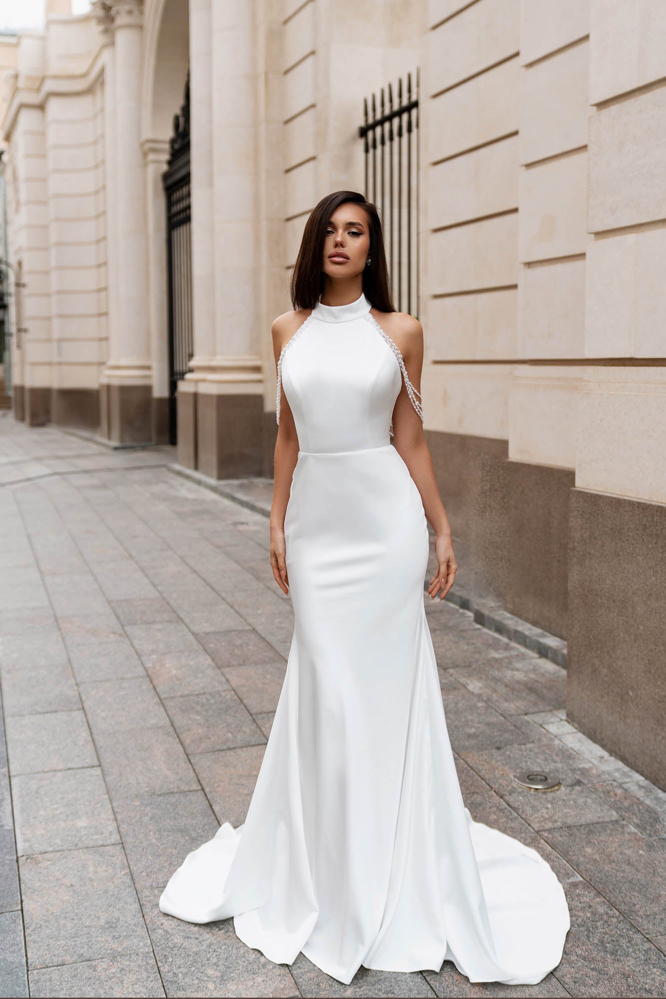 The high halter neckline adds a touch of modern elegance, framing the shoulders and collarbone beautifully. At the back, the gown reveals a dramatic open-back design adorned with delicate cascading pearl strands that drape gracefully across the shoulders and upper arms. These intricate beaded details create movement and subtle sparkle, making the dress captivating from every angle.