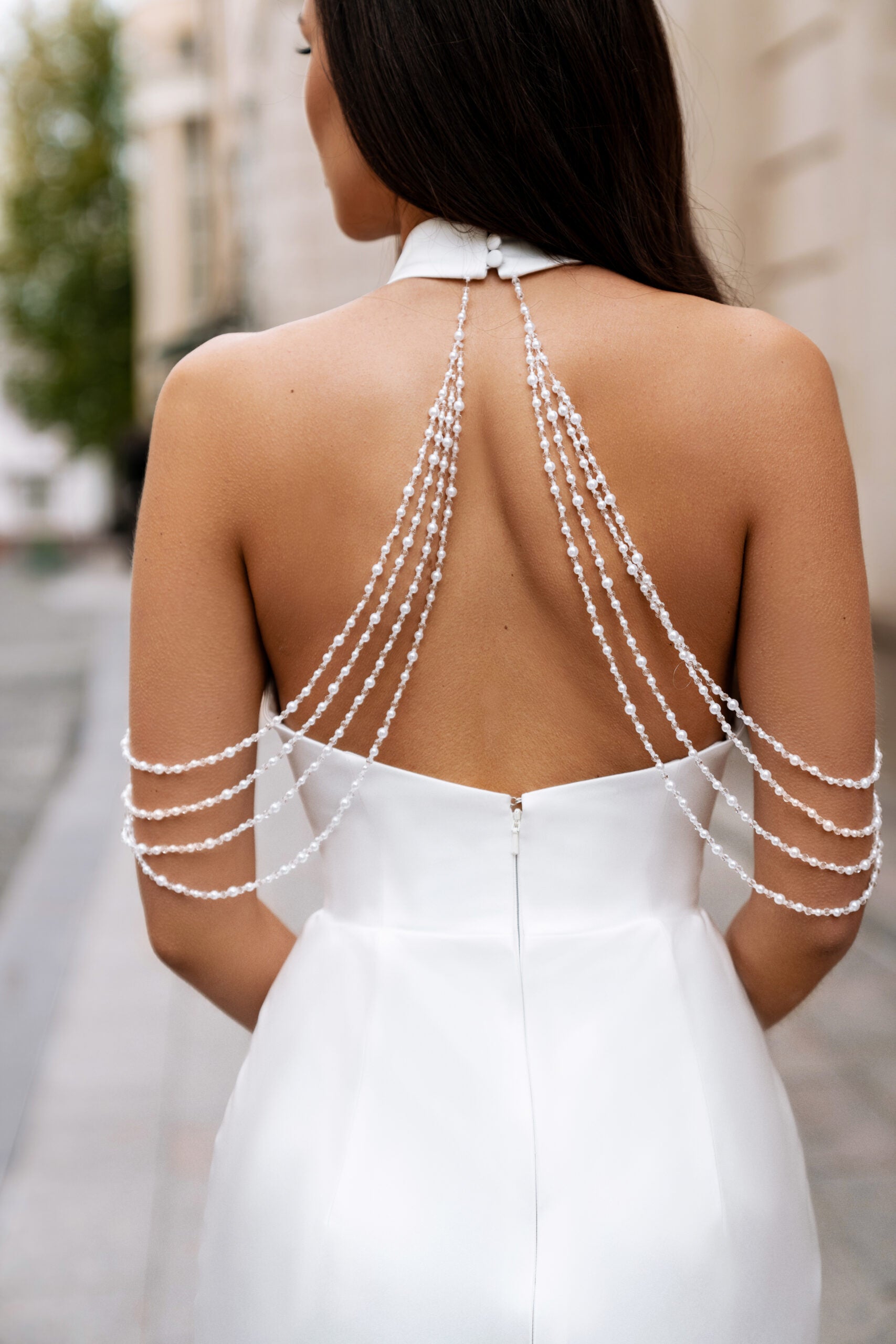 • Elegant open back with cascading pearl chains