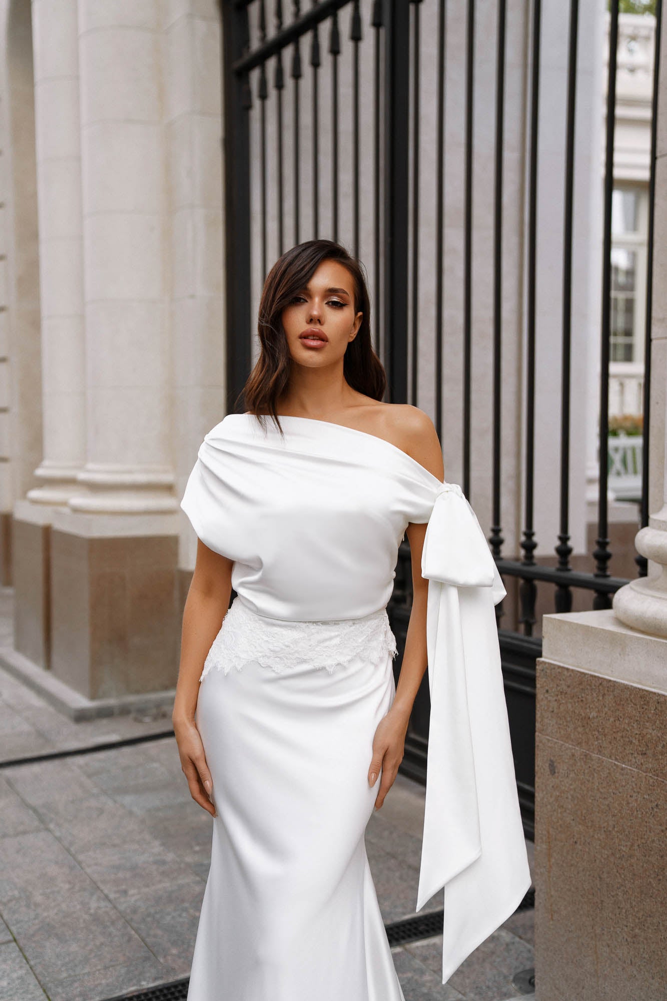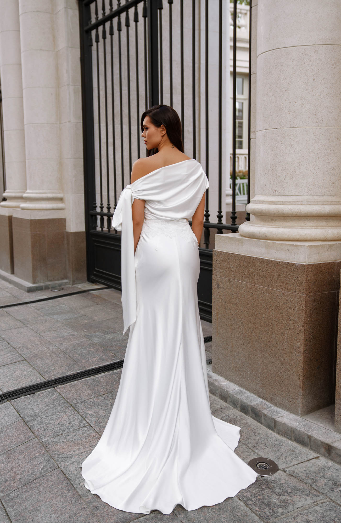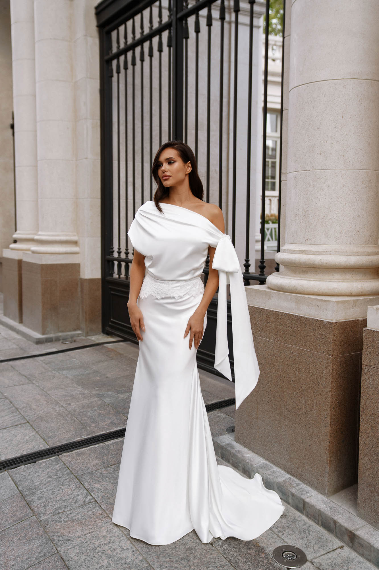 A striking statement bow detail drapes from the shoulder, adding a dramatic yet elegant element that enhances the gown’s modern couture feel. This feature brings softness and individuality to the otherwise minimal design, making the Antre gown both refined and unforgettable.