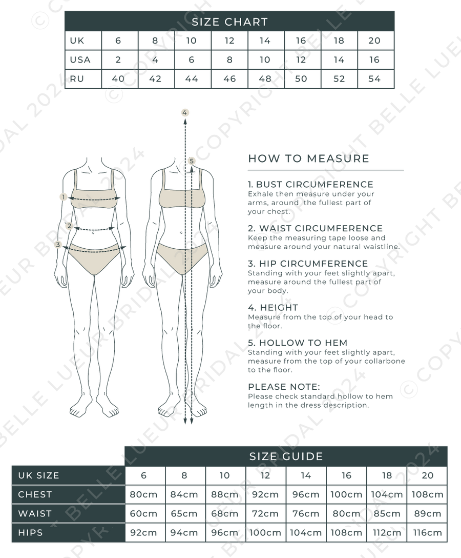 There is a 6-8 week lead time on each dress from the time of placing your order. All orders will be shipped from the UK unless otherwise stated. Please ensure you use the measurements/size guide when ordering and order via measurements not your standard size. Measurements need to be taken in centimetres if you find you are in-between two sizes please always size up.