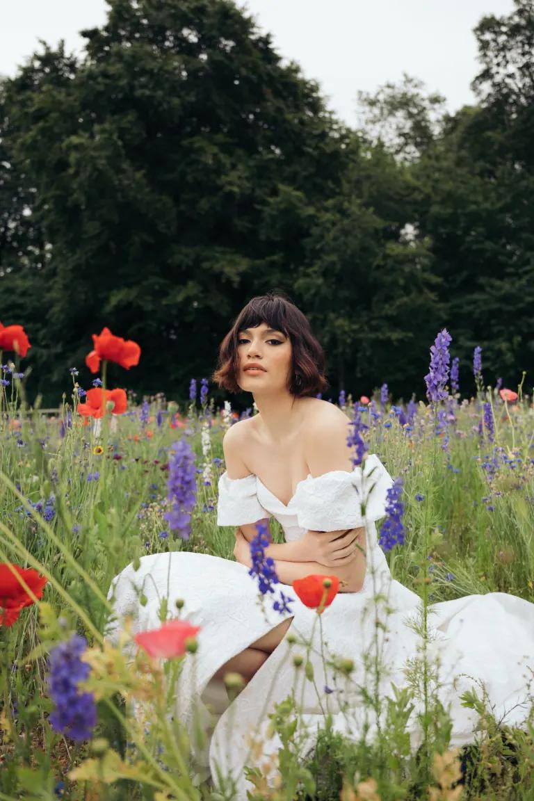 The Beau gown is a true romantic. Cut in our intricately textured bevelled floral jacquard fabric, her dramatic silhouette is effortlessly airy. The sculpted bodice is endlessly flattering, and the detachable sleeves offer incredible versatility.
