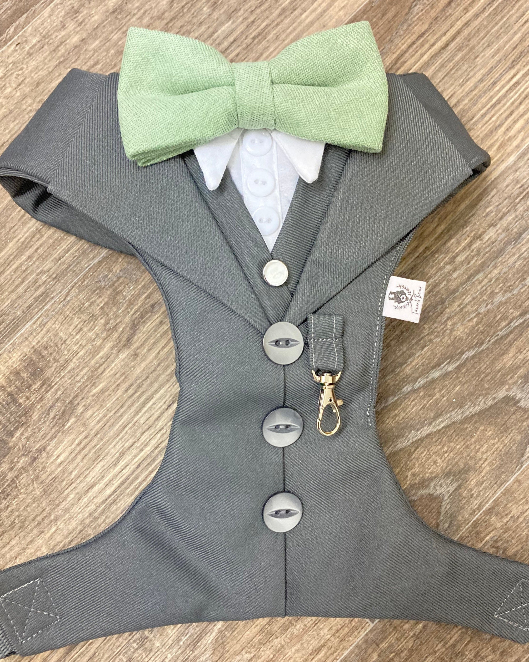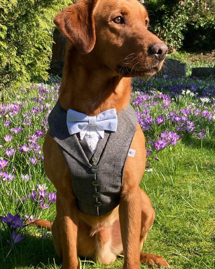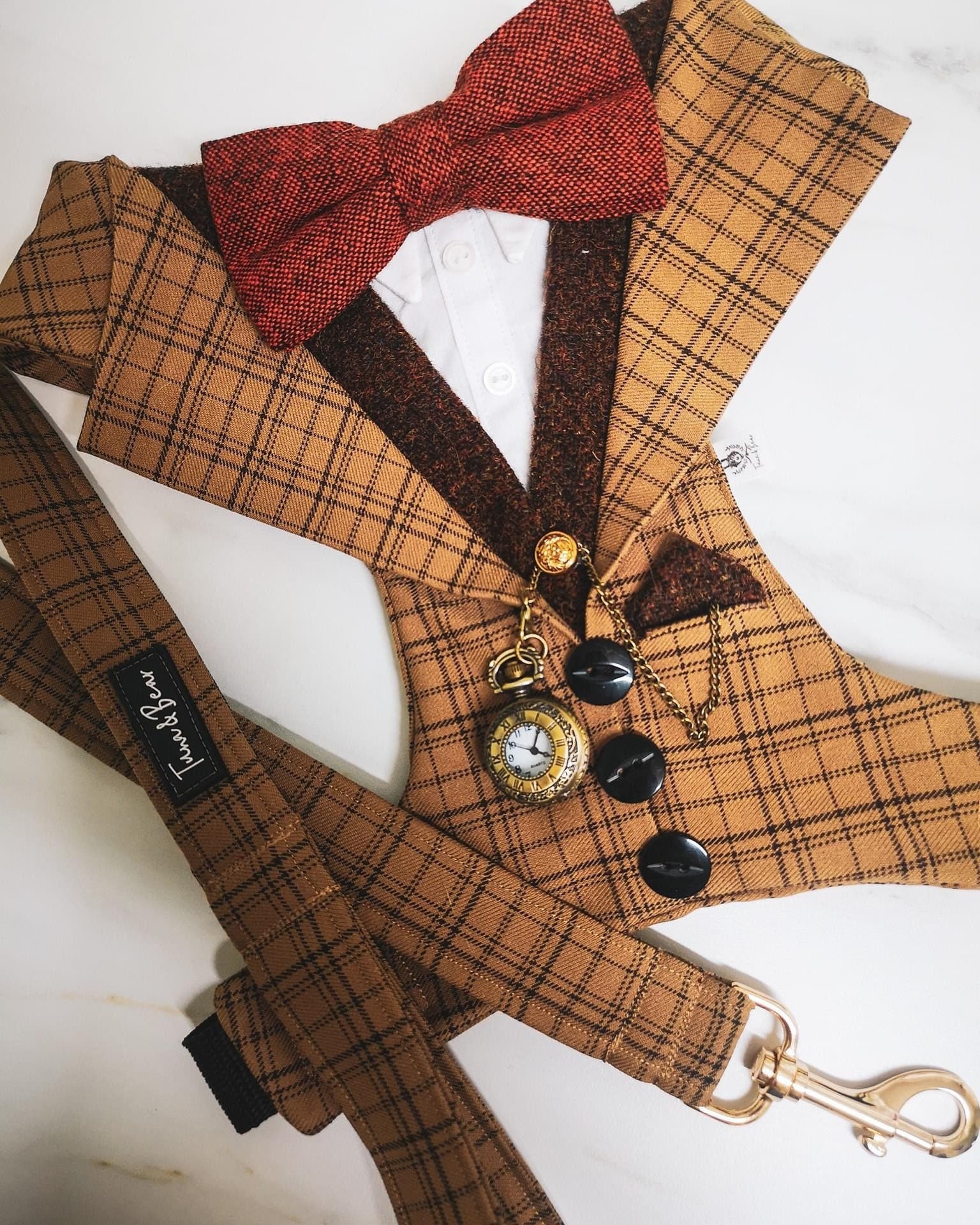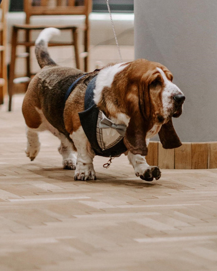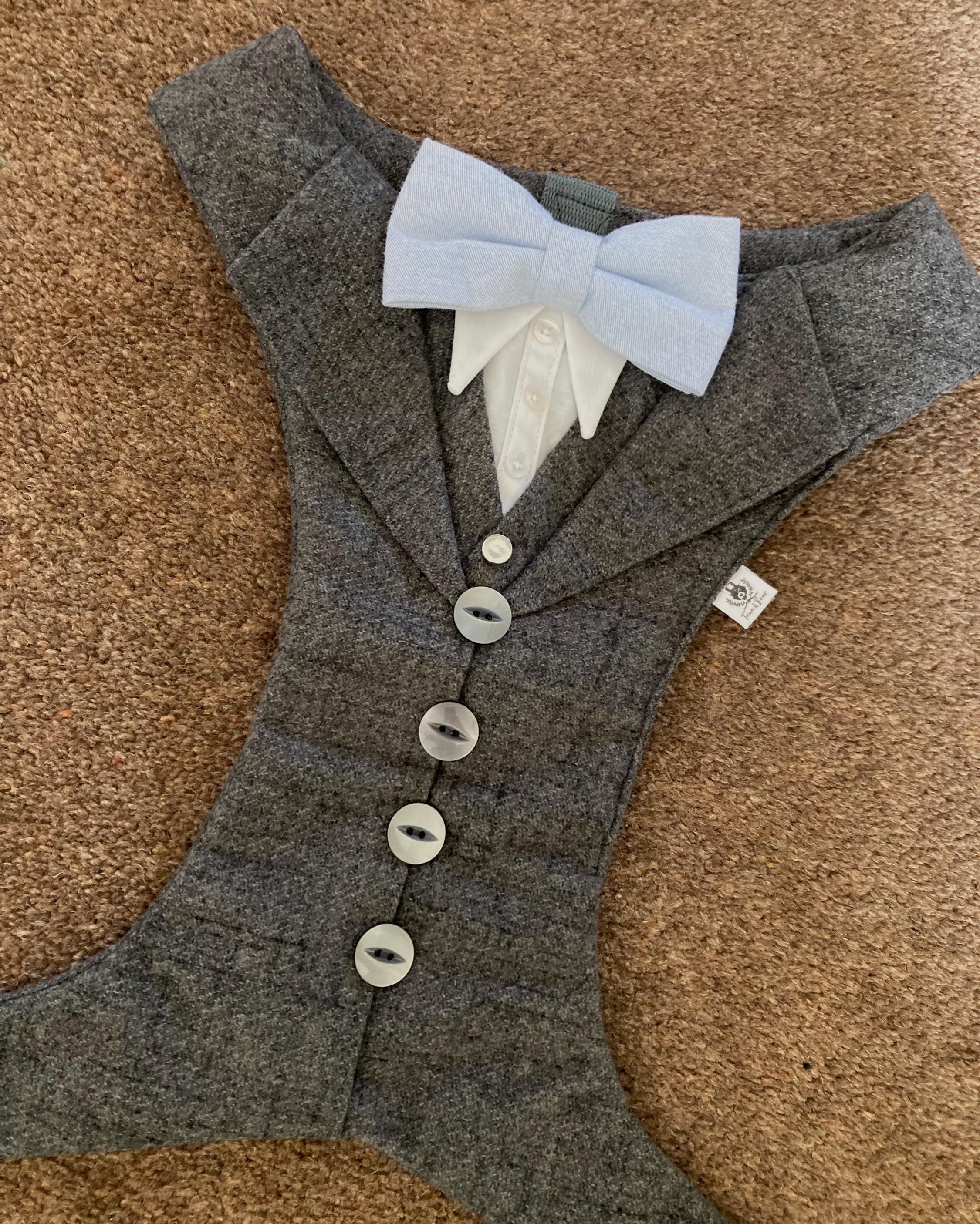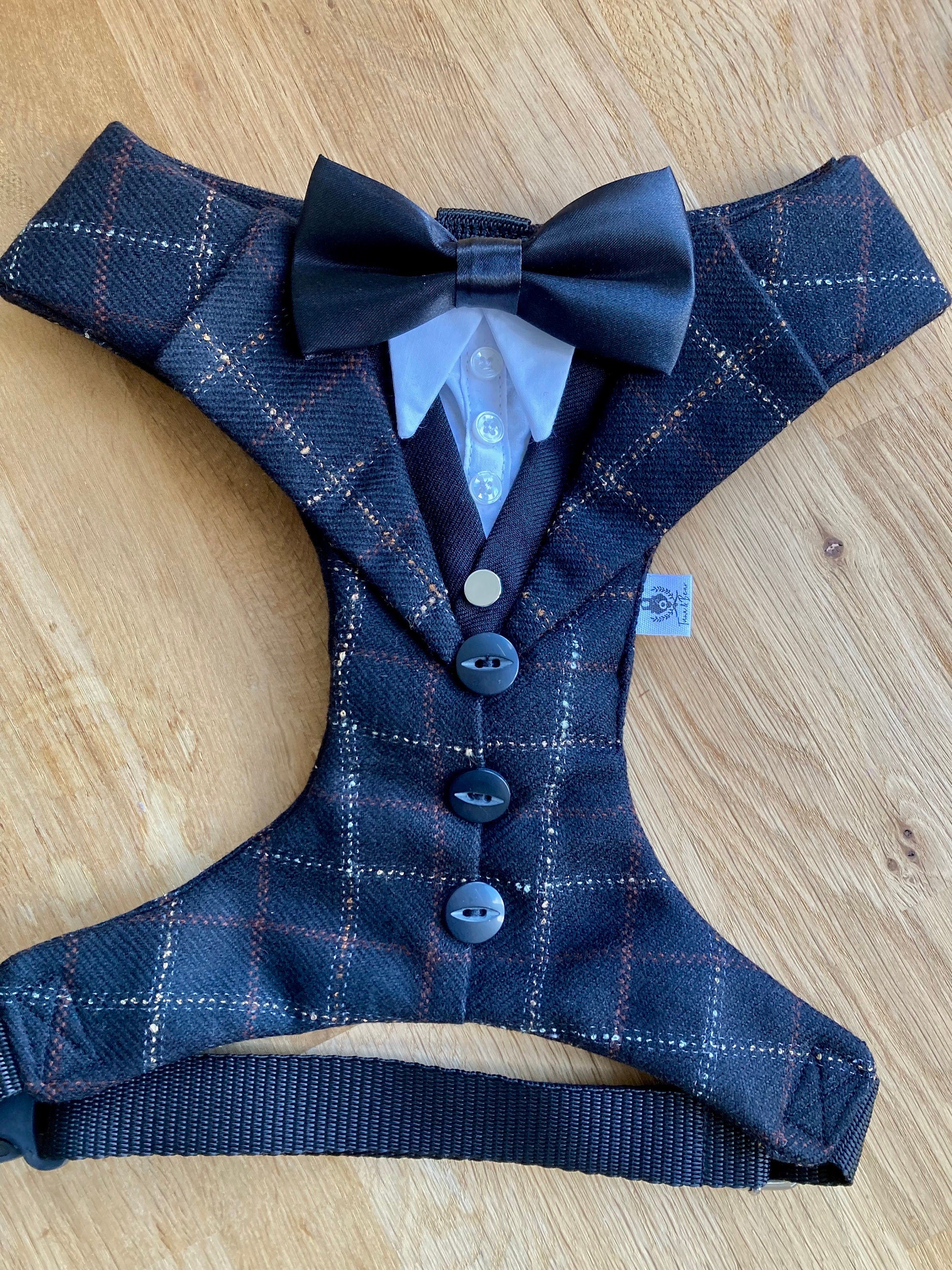 High Quality Black Check Tweed Dog Tuxedo Harness with Waist Coat and white shirt.