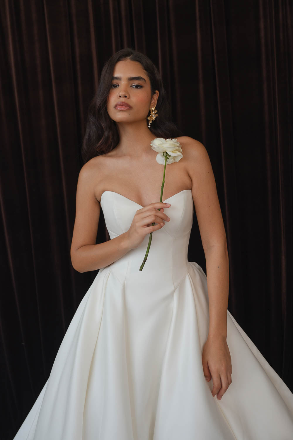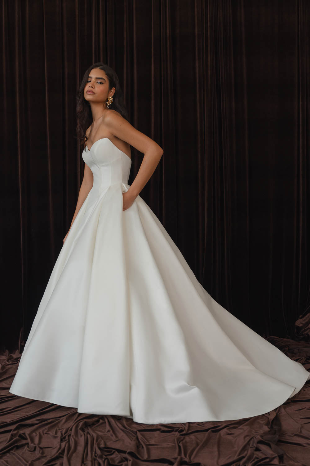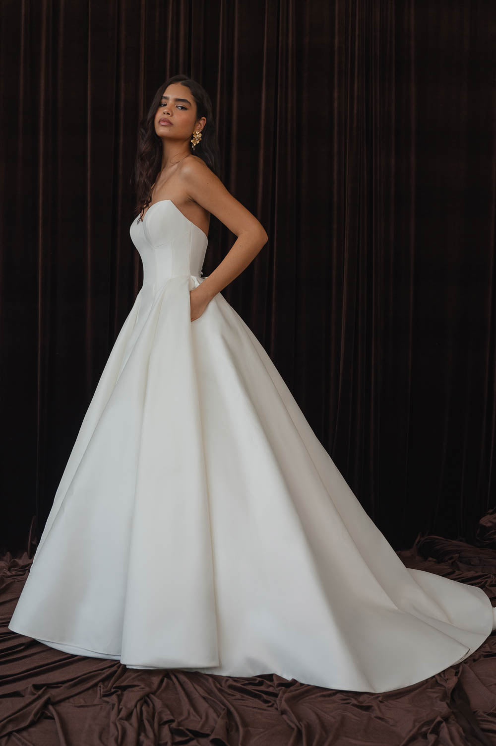 The Colette gown, cut in light and lustrous Italian taffeta fabric is a clean, yet striking show stopper. Intricate seam details sculpt a bustier bodice and subtle drop waist silhouette. Pleats in the ball skirt create dramatic volume while their vertical lines elongate your figure.